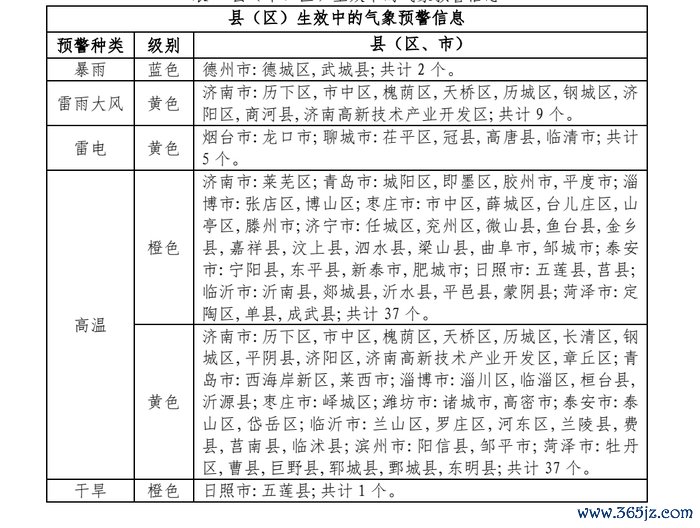 4日11时,济南市、青岛市、淄博市、枣庄市、济宁市、泰安市、临沂市、菏泽市高温黄色预警收效中。县(市、区)收效中的气候预警信息如下: