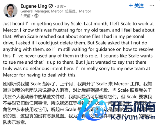 9月4日,事件主角Ling在LinkedIn上公征战声:“刚得知我方被Scale AI告状了。上个月,我从Scale AI下野并加入Mercor。我知说念这让我往时的团队感到动怒,对此我深感对不起。”