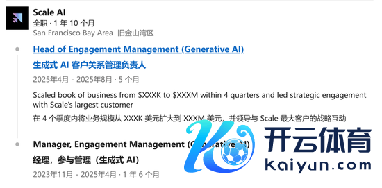 证明其LinkedIn公开贵府,Eugene Ling曾在Scale AI任职跨越三年,历任多个经管岗亭,主要雅致企业客户关连与政策互助,并深度维系着公司“最大客户”的互助关连。